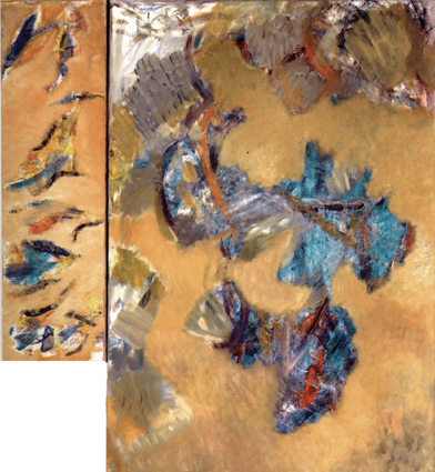 Ilse Abka-Prandstetter 17: "Blau fliegend mit Trabant" Pigment und Bindemittel, 130cm x 90cm und 130cm x 30cm 1995